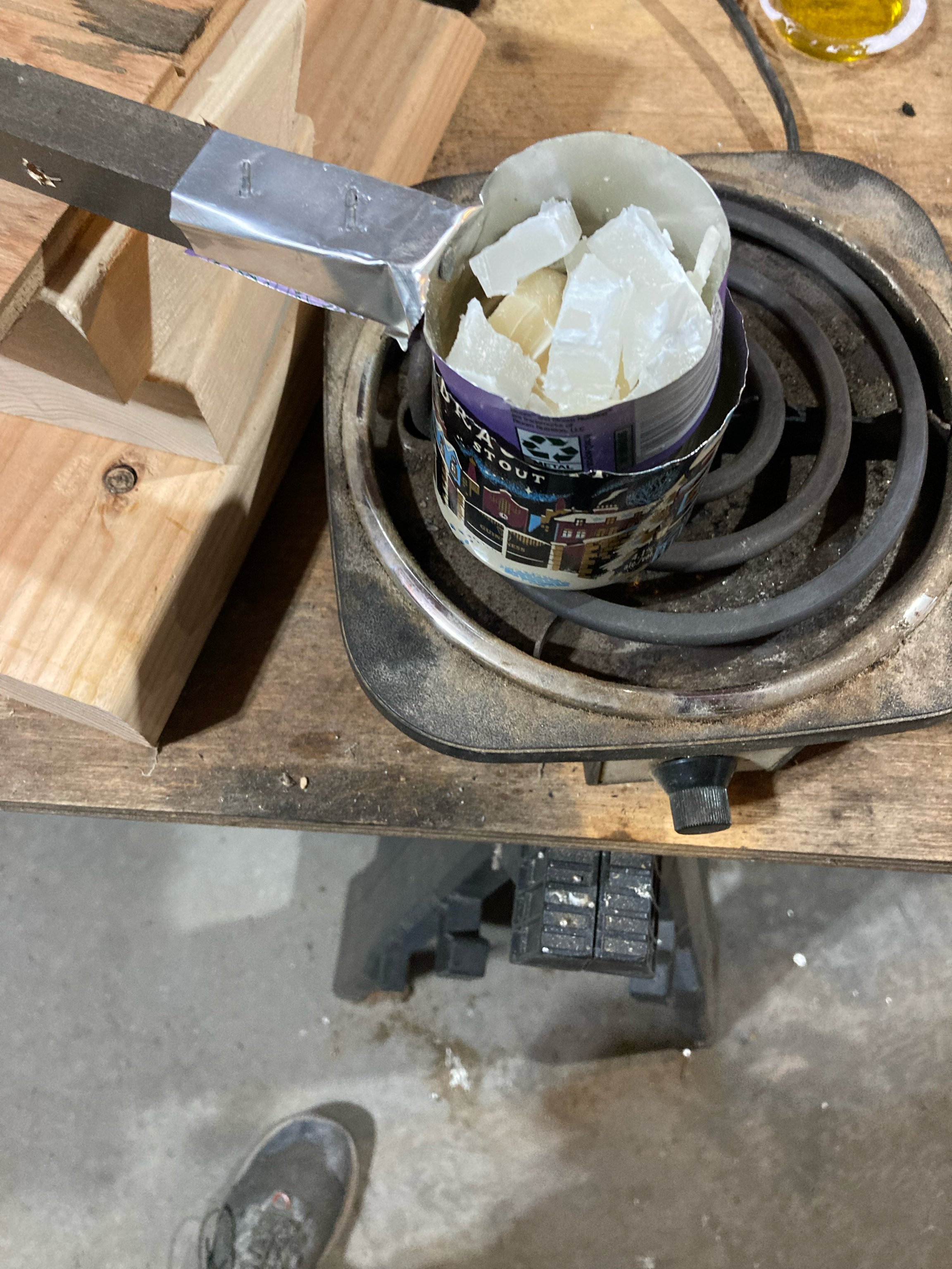After your lead bullets are made it’s time to lubricate and size them. There's a multitude of lube recipes online and on forums. I chose to go with a simple beeswax, paraffin wax and olive oil mixture because these ingredients were readily available. The ratio was 2 parts beeswax, 2 parts paraffin wax, 1 part olive oil. I melted all these in a small double boiler setup on a hotplate and keep it in my small melting vessel rigged up from an energy drink can and a wooden handle. A common technique to lubricate bullets is called pan lubing. I decided not to do this because it requires a lot of lube and more cooling time. I dipped my bullets in the melted lube almost like making a candle. You should only dip them to a point between the last lube groove and the crimp line. The upside of pan lubing is that when you let everything cool off and push or pull the bullet out, it cleanly comes free of all the wax except the amount that fills the grooves, in the grand scheme of things, this actually uses less lube because it reduces waste, with the dipping technique the entire first half of the bullet gets a nice coating which either sheers off during sizing, or just gets smeared on to the rest of the bullet.